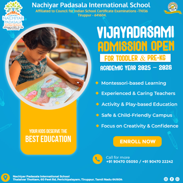 At Nachiyar Padasala International School, we believe every child is unique and full of potential. Our school is a place where learning is joyful, values are nurtured, and dreams take shape. We offer quality education from Toddler Montessori to Grade XII (CISCE curriculum), blending modern teaching with strong cultural values. Our goal is to help students grow academically, socially, and emotionally in a safe and caring environment.